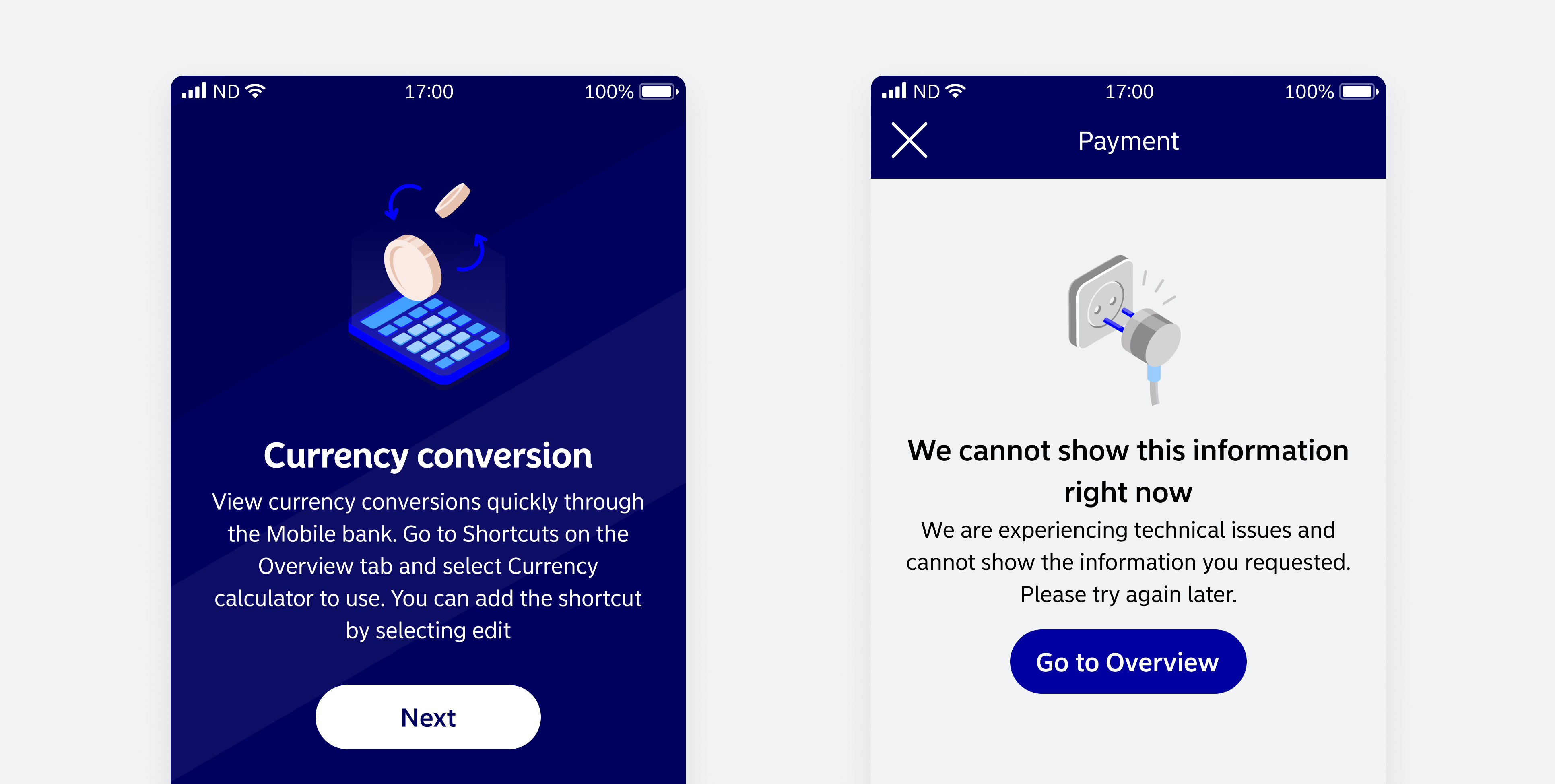 - UI illustrations (instructional, error, and empty states) should use a colour scheme that works seamlessly in both Light Theme and Dark Mode.
