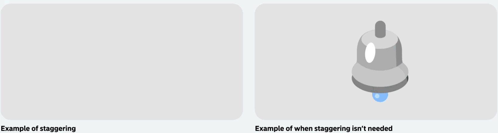 Staggering animations creates a cleaner, less distracting interface by introducing elements one after another instead of simultaneously. This guides the user’s attention smoothly and prevents visual overload.